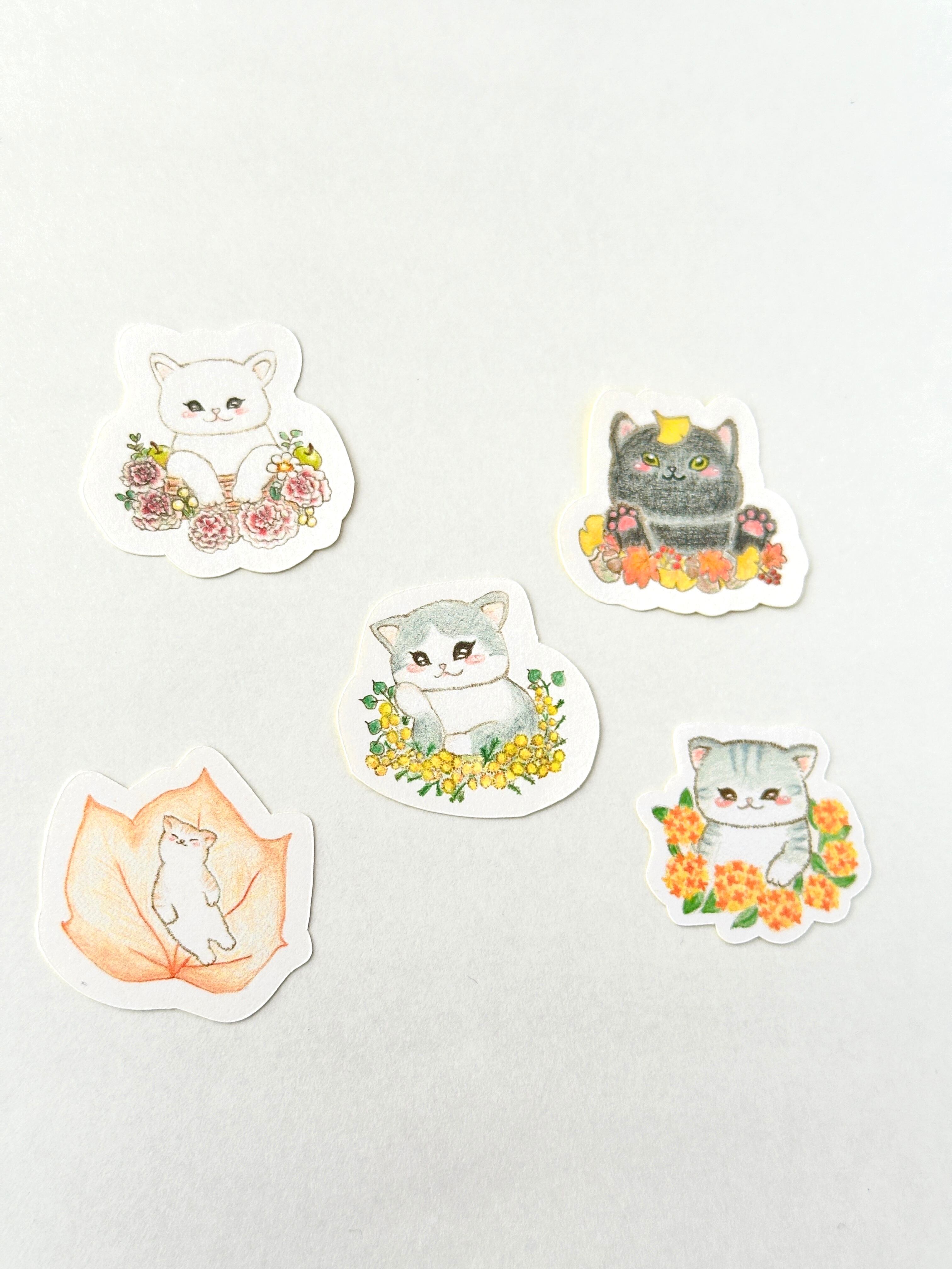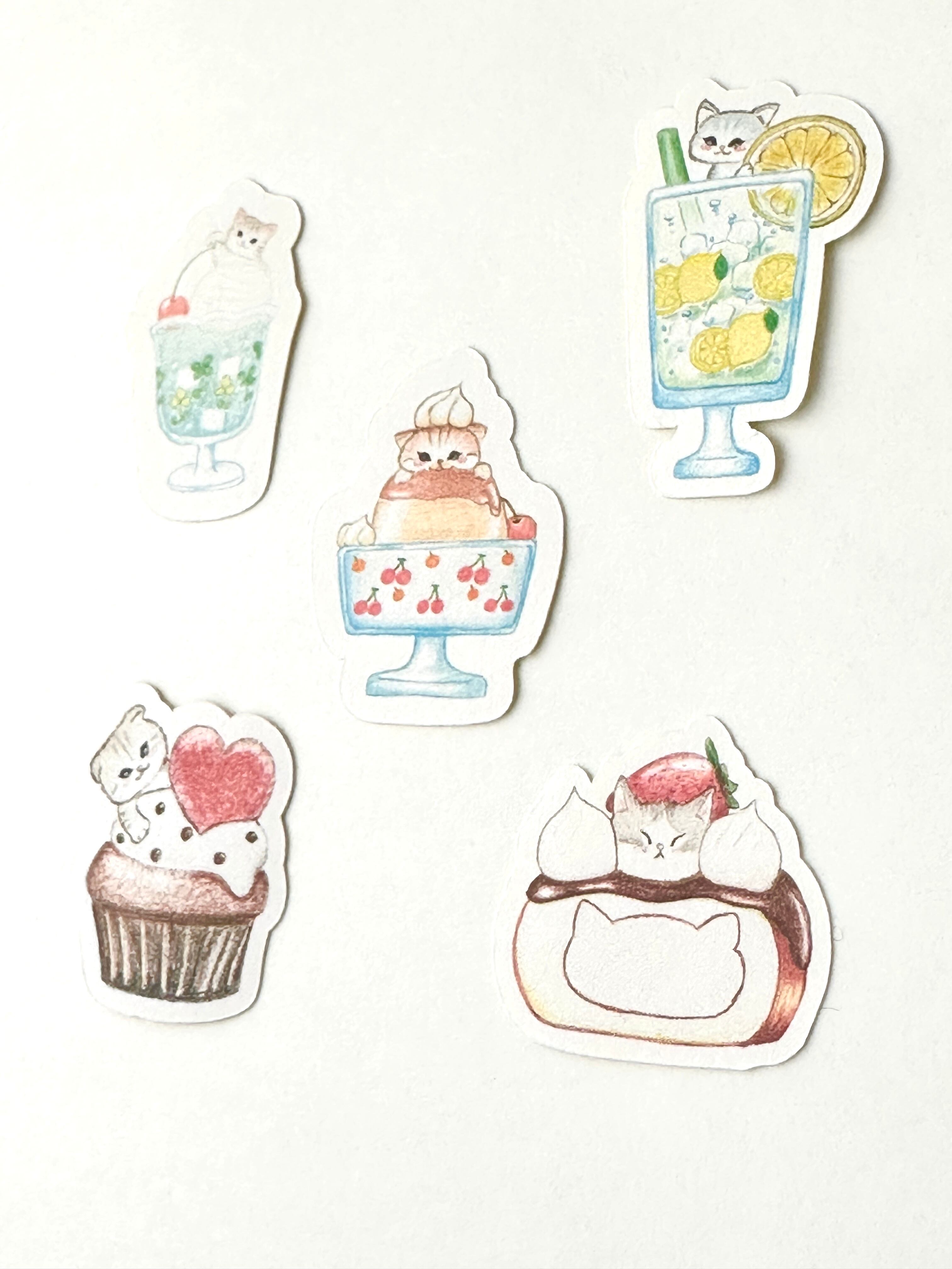 可愛らしい猫たちと色とりどりのスイーツ、そして美しいお花たちが描かれたフレークシールセットです。日常のちょっとしたアイテムに華やかさを添えてくれるデザインは、見る人の心を躍らせてくれます。